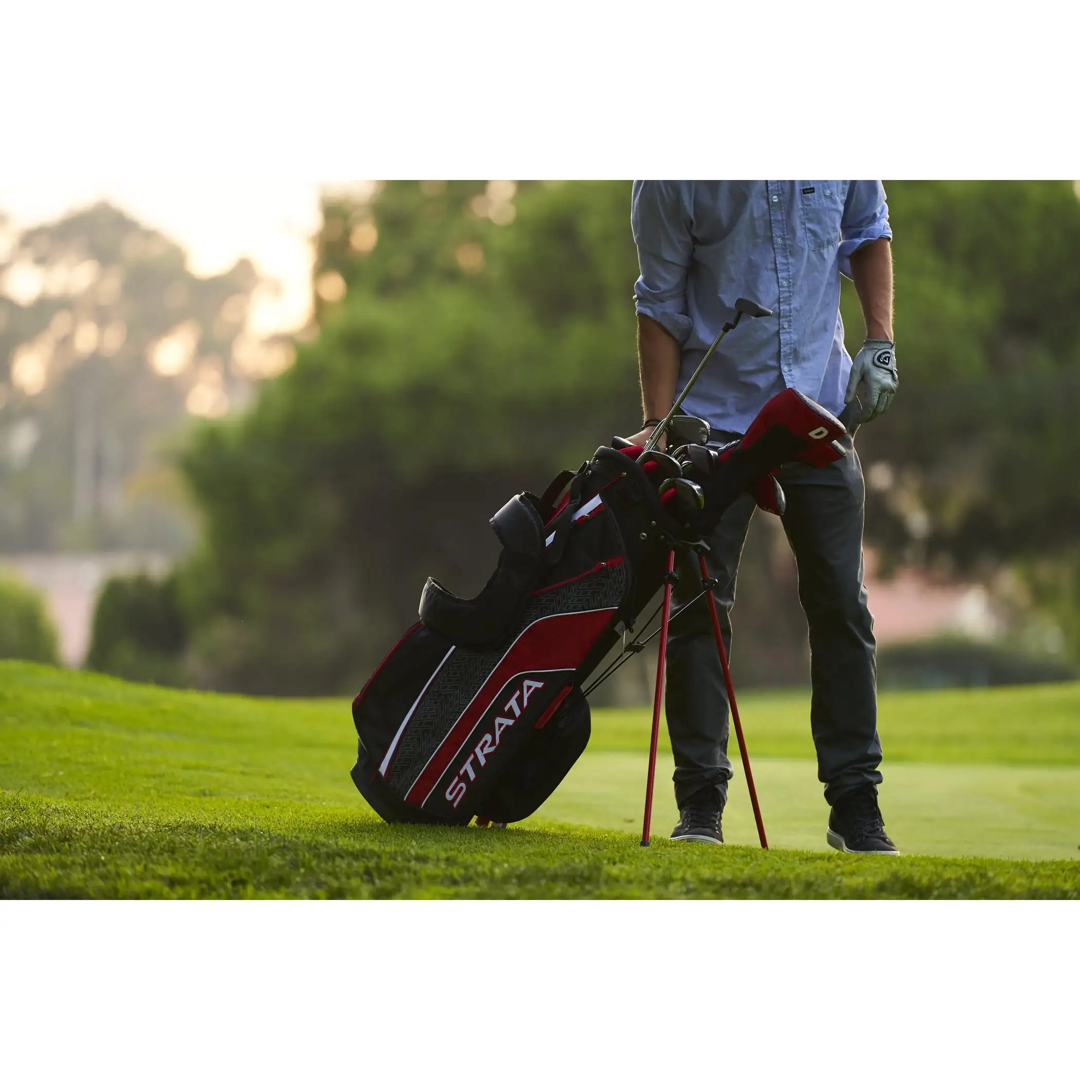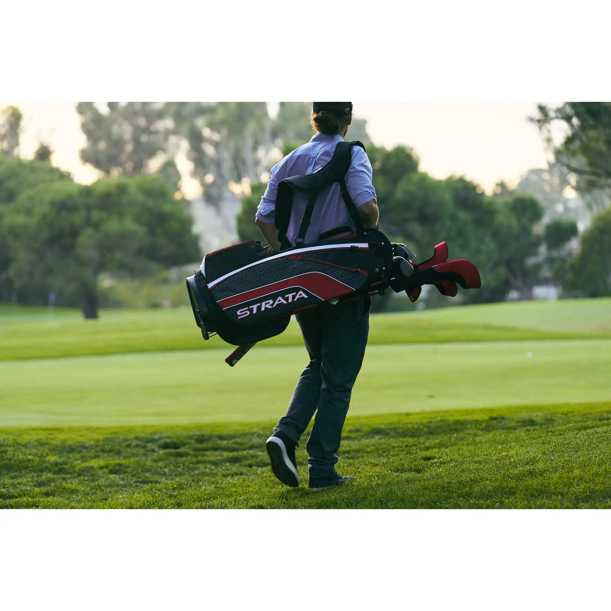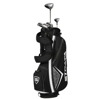 LLAWAY STRATA FULL SET The Strata Set is designed to give you maximum performance right out of the box for more confidence from tee-to-green. The lightweight 460cc forged driver fairway wood hybrid irons and putter make up a set that provides a great combination of distance forgiveness and control and is very easy to hit. Driver – A lightweight 460cc forged driver that has a large sweet spot a titanium head and provides more forgiveness to help you hit it farther off the tee. (Headcover included) Fairway Wood – This oversized fairway wood is very forgiving and has a more aerodynamic head shape for long high flying shots. (Headcover included) Hybrid – A great alternative to difficult long irons that gives you more confidence on a variety of shots. Irons 6-PW – These stainless steel irons offer a great combination of forgiveness and control. Putter – A mallet putter with alignment to help give you incredible accuracy. Stand Bag – A lightweight and durable stand bag that comes with five convenient pockets an additional cooler pocket a rain hood and a backpack strap system.