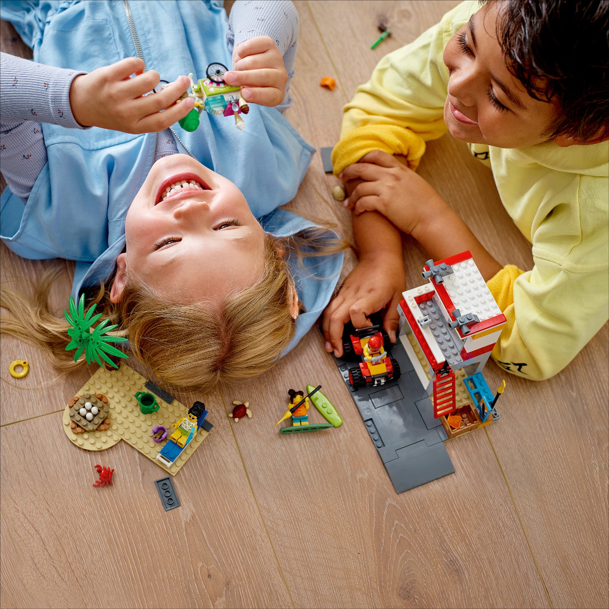 - What’s in the box? – Everything kids need to build a 2-level Lifeguard Station, ATV, ice-cream cart and beach setting with a palm tree, plus 4 minifigures and crab and turtle figures
