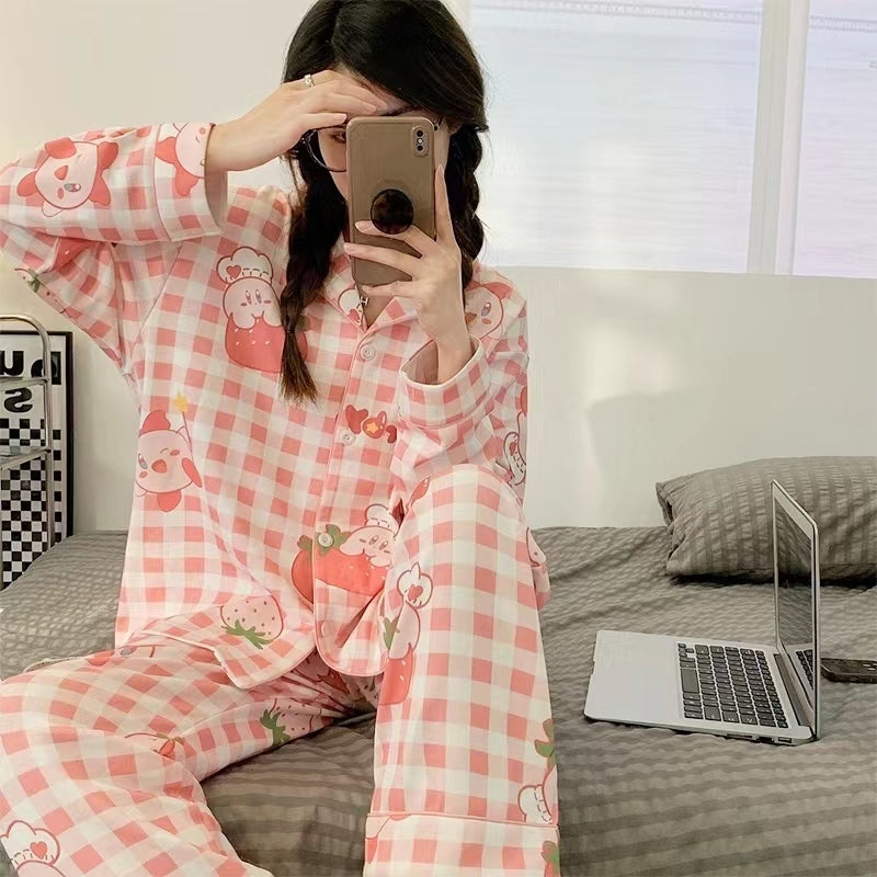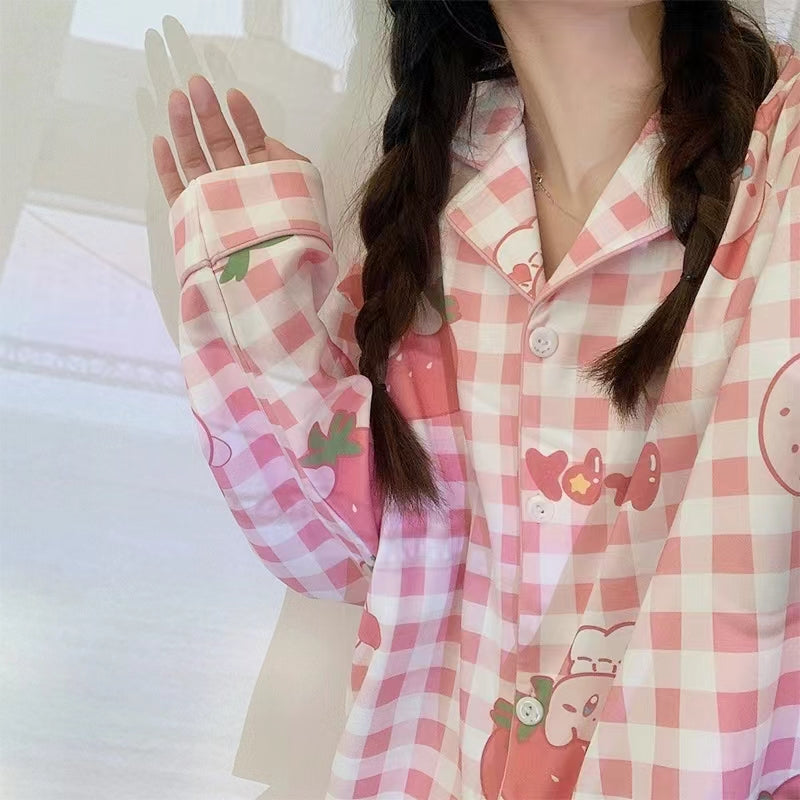 Plaid Pink Strawberry Long Sleeve Button Down 2 Pcs Pajama Set