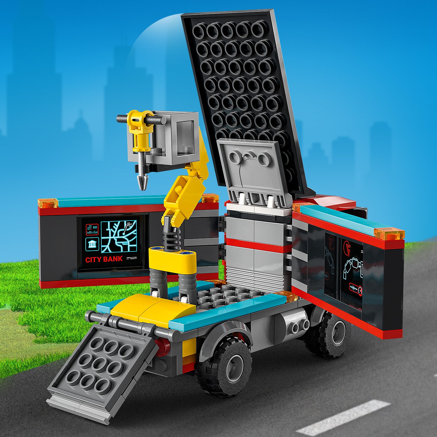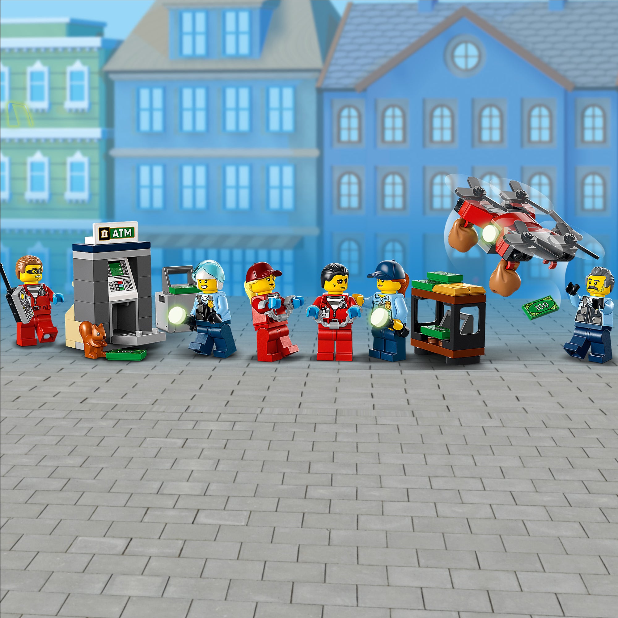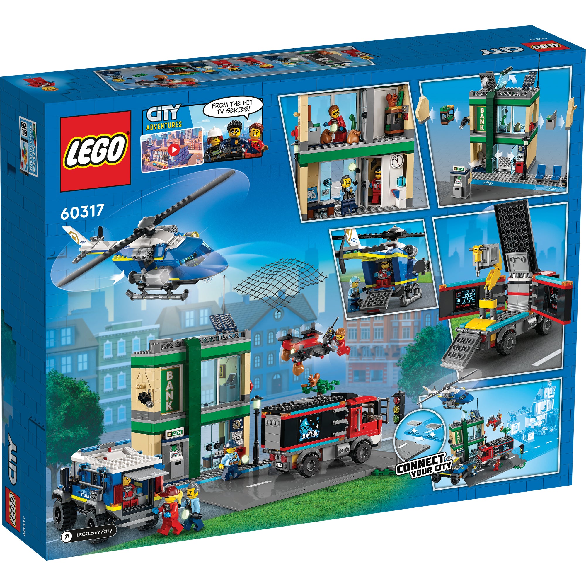 - What’s in the box? – Everything kids need to build a multifunctional bank building, crooks’ heist truck, police helicopter and police truck, plus 6 minifigures, including 5 LEGO® City TV characters