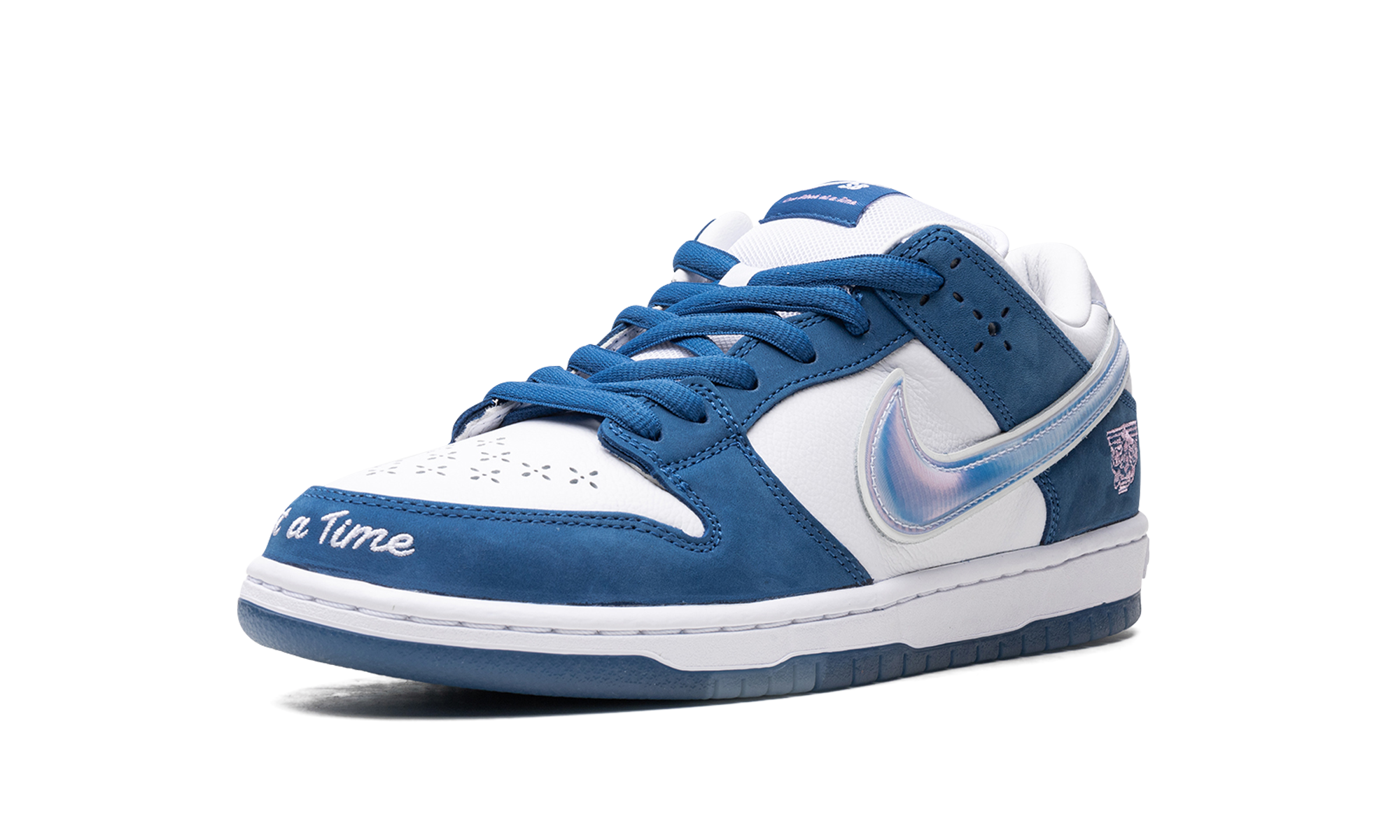 The Born x Raised x Nike SB Dunk Low “One Block at a Time” is the first-ever collaboration between the California-based streetwear brand and Nike SB on the iconic skate shoe. The “One Block at a Time” SB Dunk by Born x Raised features a decidedly “Los Angeles” look, as the shoe’s white and blue color block is undoubtedly inspired by the Los Angeles Dodgers’ team uniforms. The shoe features a white leather base with blue nubuck overlays and unique perforations on the toe. “One Block at a Time” is embroidered on the front of the toe cap across both shoes. A pink branding emblem appears on the lateral side of the heel. The side Swooshes are featured in an iridescent material with a puffed effect. The shoe is mounted on a white rubber midsole. A “Born SB” graphic is found underneath the clear rubber outsole. Release date: June 1, 2023